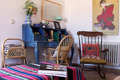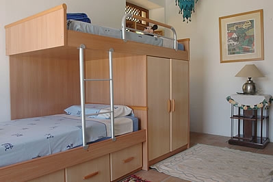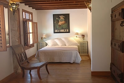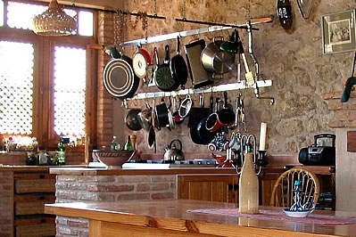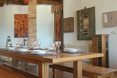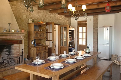 Dieses sehr komfortable Refugium wurde sehr ansprechend eingerichtet. Ãber die Eingangshalle im Erdgeschoss gelangt man in das Herzstück des Hauses: Ein groÃer idyllischer Küchen-/ Essbereich mit einem langen Speisetisch samt Bänken, einem Marmorbecken, Arbeitsflächen aus Nadelholz, einem groÃen Kühlschrank und Herd. AuÃerdem umfasst das Erdgeschoss eine Wohnstube, ein Doppelschlafzimmer mit Einzelbetten, ein Schlafzimmer mit Etagenbett, einen kleinen Gymnastikraum sowie ein Bad/ WC mit integrierter Dusche. Ausstattung der ersten Etage: Hauptschlafzimmer mit eigenem Bad/ WC, 2 Doppelschlafzimmer mit Balkon, Bad/ WC und integrierter Dusche sowie eine groÃe Terrasse. Eine weitere separate Treppe führt vom Erdgeschoss in eine zusätzliche kreisförmige Wohnstube mit einem mittigen, offenen Kamin und Türen, durch die man auf die Terrasse gelangt. Weitere Ausstattung: Zentralheizung, CD-Spieler und Telefon mit Zählmesser.Bitte beobachten Sie: Das Haus verfügt über eine WIFI-Internetverbindung, die ohne Mehrkosten genutzt werden kann.