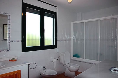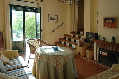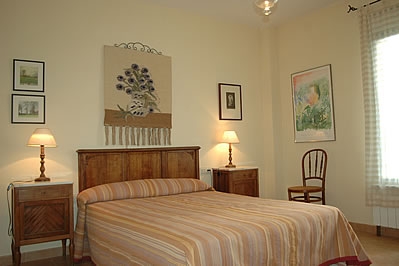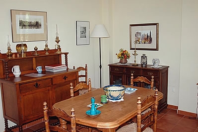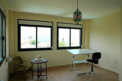 Inside, a warm ambience makes you feel directly at home. On the ground floor, the hall leads in to a spacious lounge/dining room with open fireplace and comfortably furnished with 2 sofas, dining table for 6 and several wooden pieces and paintings that give the house its' own personality. There is also television and a music equipment. The kitchen is well equipped with a 4 rings gas hob, oven, microwave, fridge/freezer, washing machine and dishwasher. There is also a shower room on this floor with wc and basin. On the first floor there are two twin-bedded rooms, a double bedroom and a large bathroom, all flooded with light. Stairs lead to a tower room from with nice panoramic views across the valley to the hills beyond. At the moment it is used as a studio, and with the windows open and light flooding in, it is a marvellous place to paint. The house has double glazing and central heating, making it ideal for both summer and winter stays.
