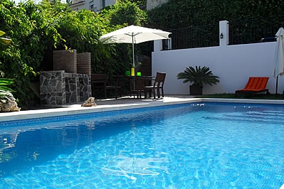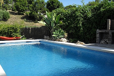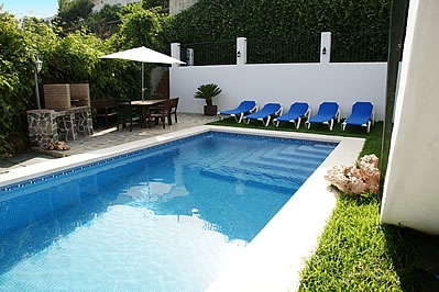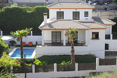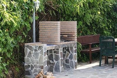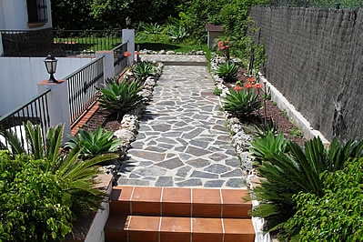 The villa is located on the edge of Mezquitilla, a small fishing village, just 13 km from the lively resort of Nerja and only a 40 minute drive from Malaga on the Costa del Sol, making it a great base for anyone wishing to explore Andalucia. The beach is only 500 m away with a somewhat steep path, not the best way to get there. A large variety of beaches can be found nearby, all with different characteristics. Many have a play area for children and some even provide ping pong tables! The water park at Torre del Mar and plenty of shops and markets, including a shopping mall at Velez, are only a 7 minute drive away. Many excellent restaurants are also close. The garden of the villa is set on two levels: on the ground floor level you will find grass areas and an outside dining terrace adjacent to the living room. On a lower level, you will find a private pool (8x4 m), a barbecue, sun loungers and plenty of space for the kids to play.