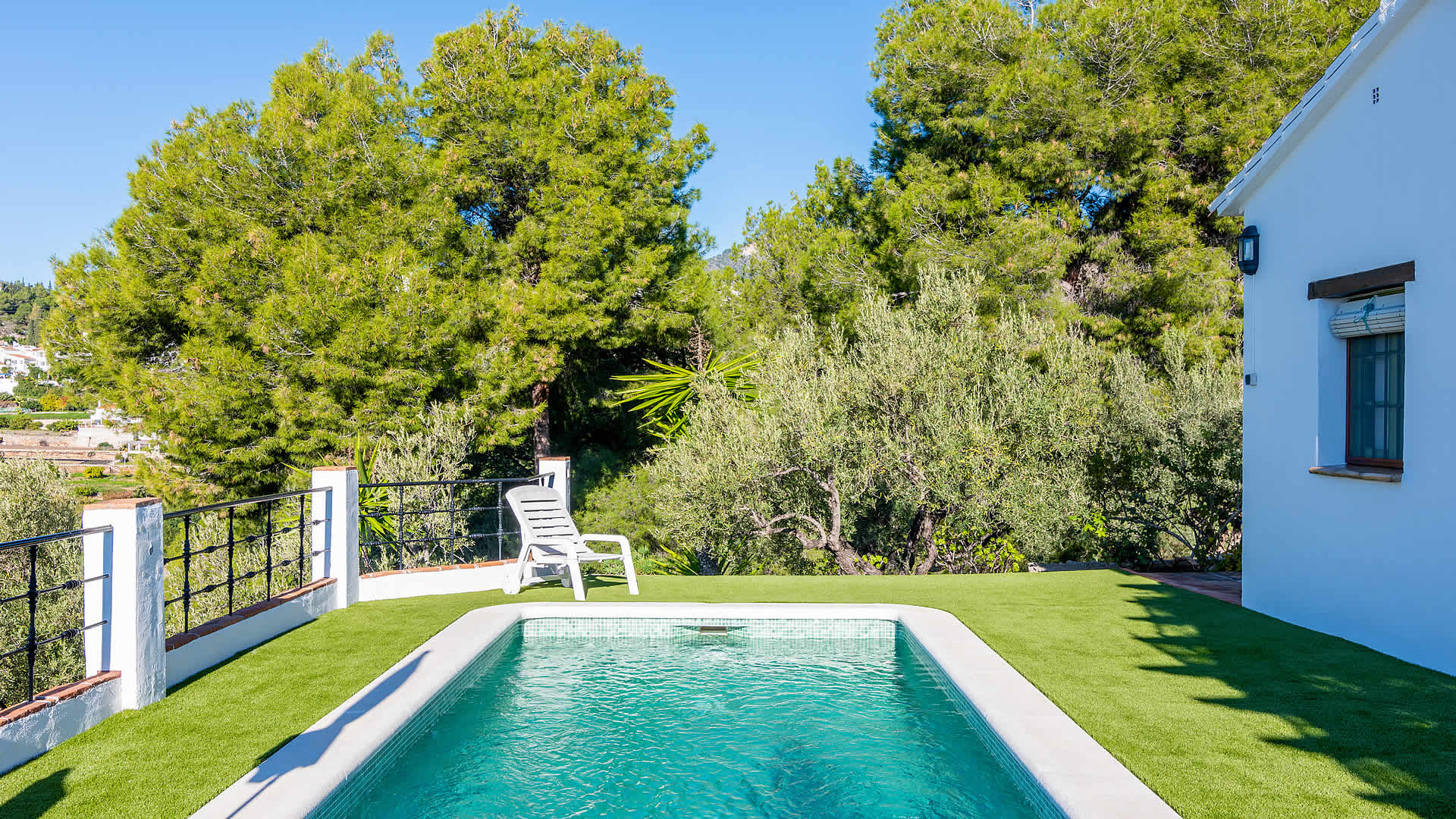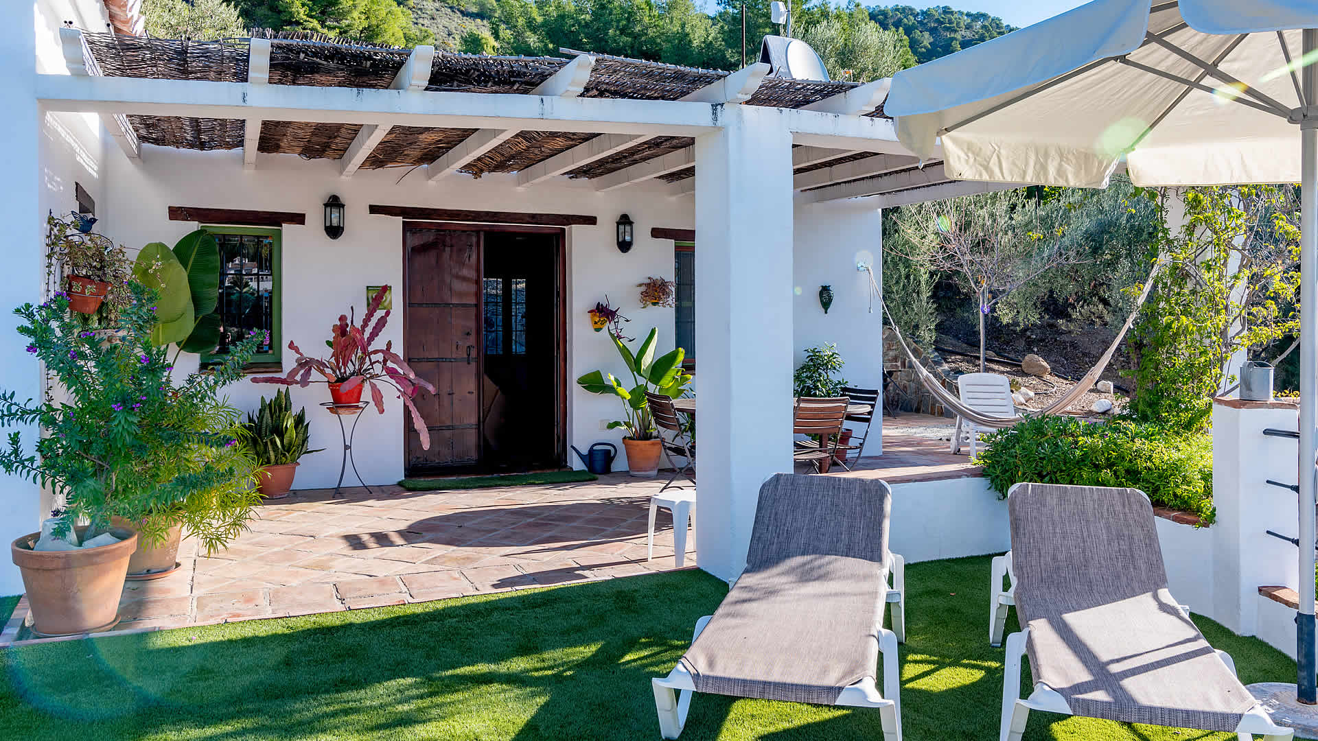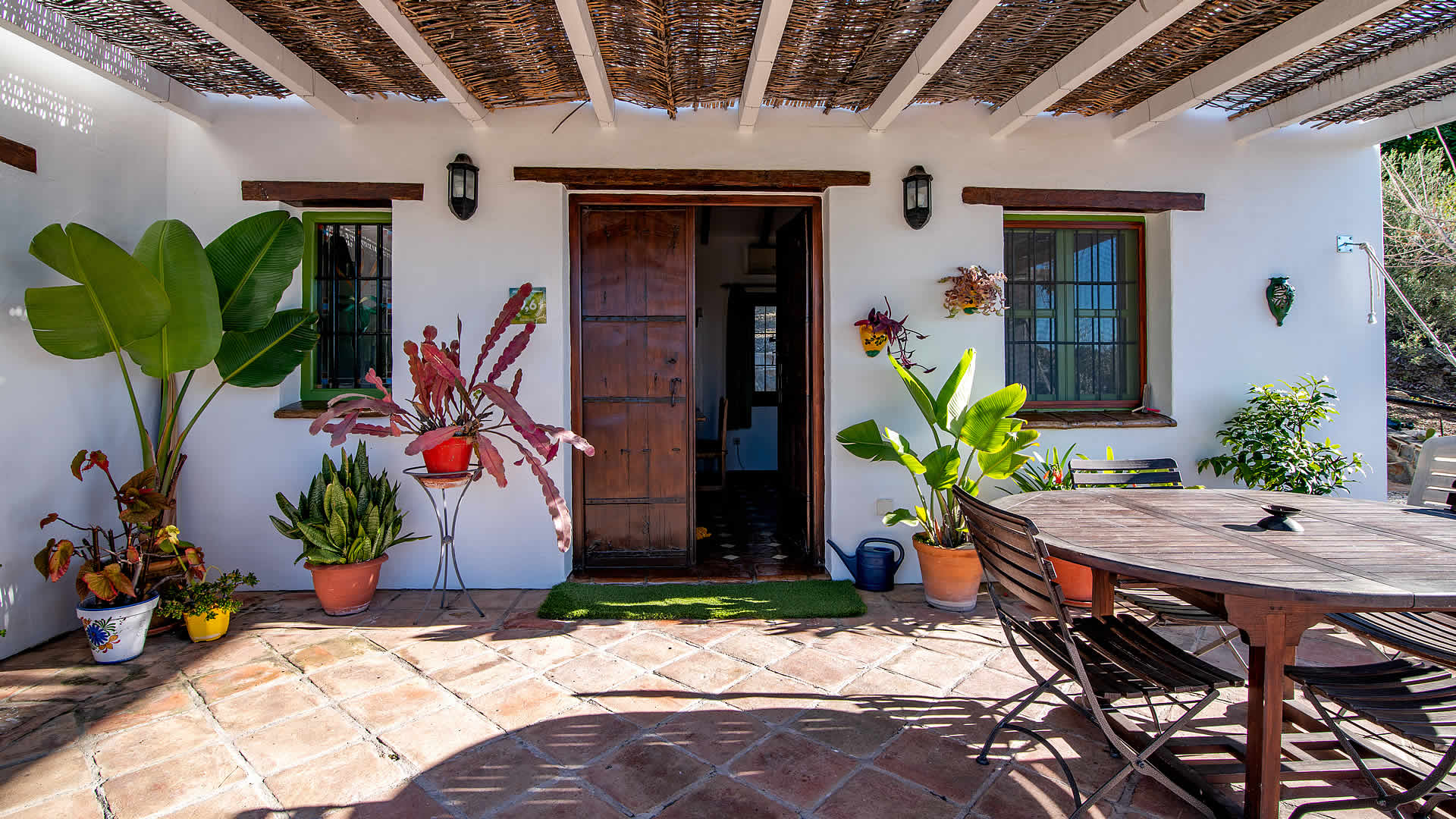 La casa se localiza al norte de Nerja, dentro del Parque Natural de Sierra Tejeda, en plena naturaleza. Está presente la flora y fauna tÃpicamente mediterránea y con un poco de suerte hasta podrá ver ciervos, jabalÃes y otros animales salvajes del Parque! Los últimos 50 metros a la casa se hacen por una empinada pista de cemento. Una vez en la casa nos encontramos con un sombreado porche, un lugar ideal para echar una siesta, con espectaculares vistas a la campiña circundante y que alcanzan hasta la costa. El porche continúa con una soleada terraza equipada con tumbonas y piscina privada (5 x 3m). Se incluye una barbacoa para sus comidas al aire libre.