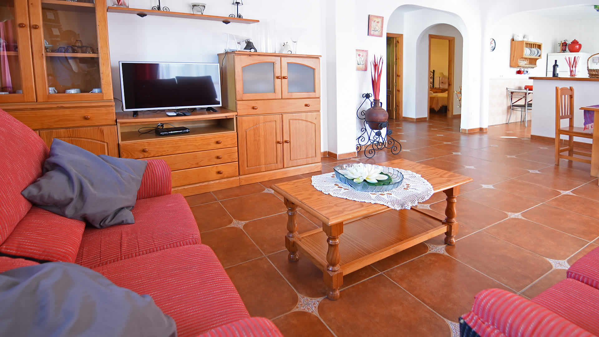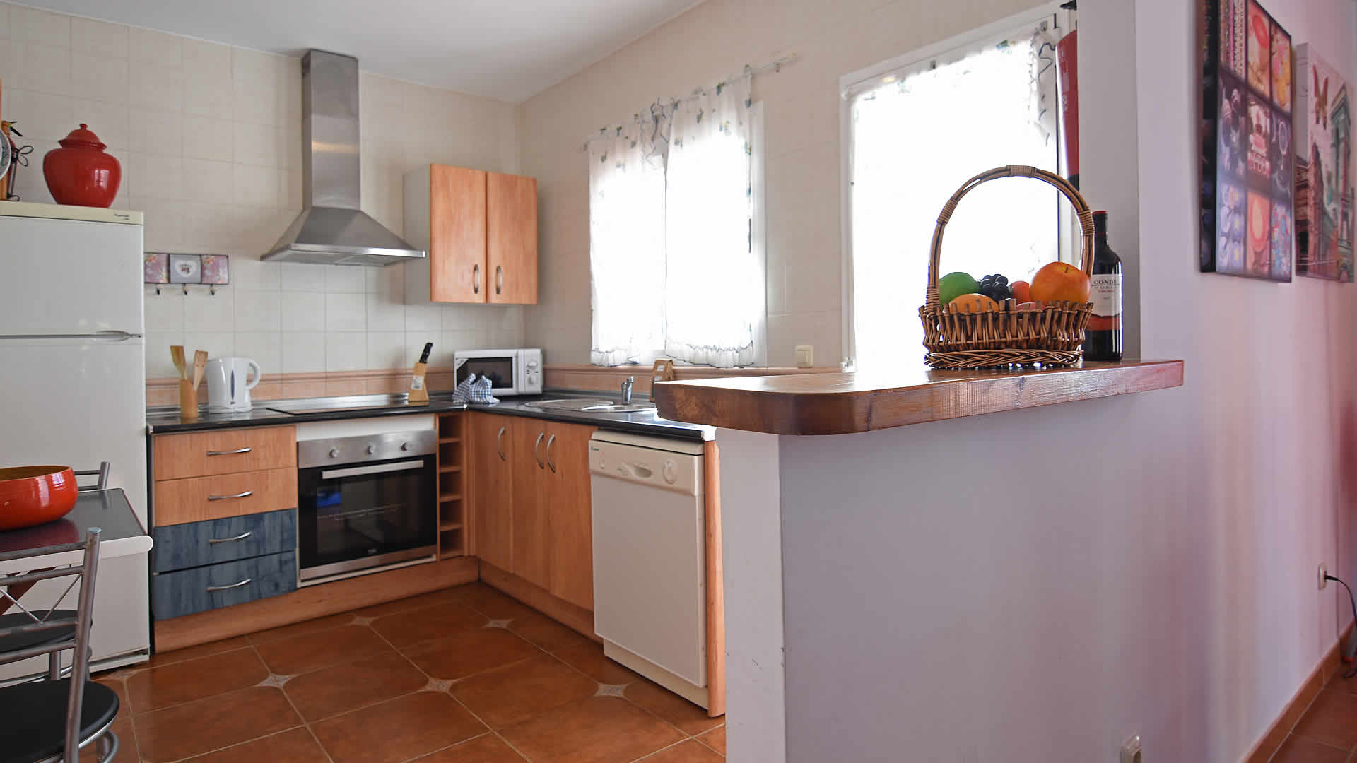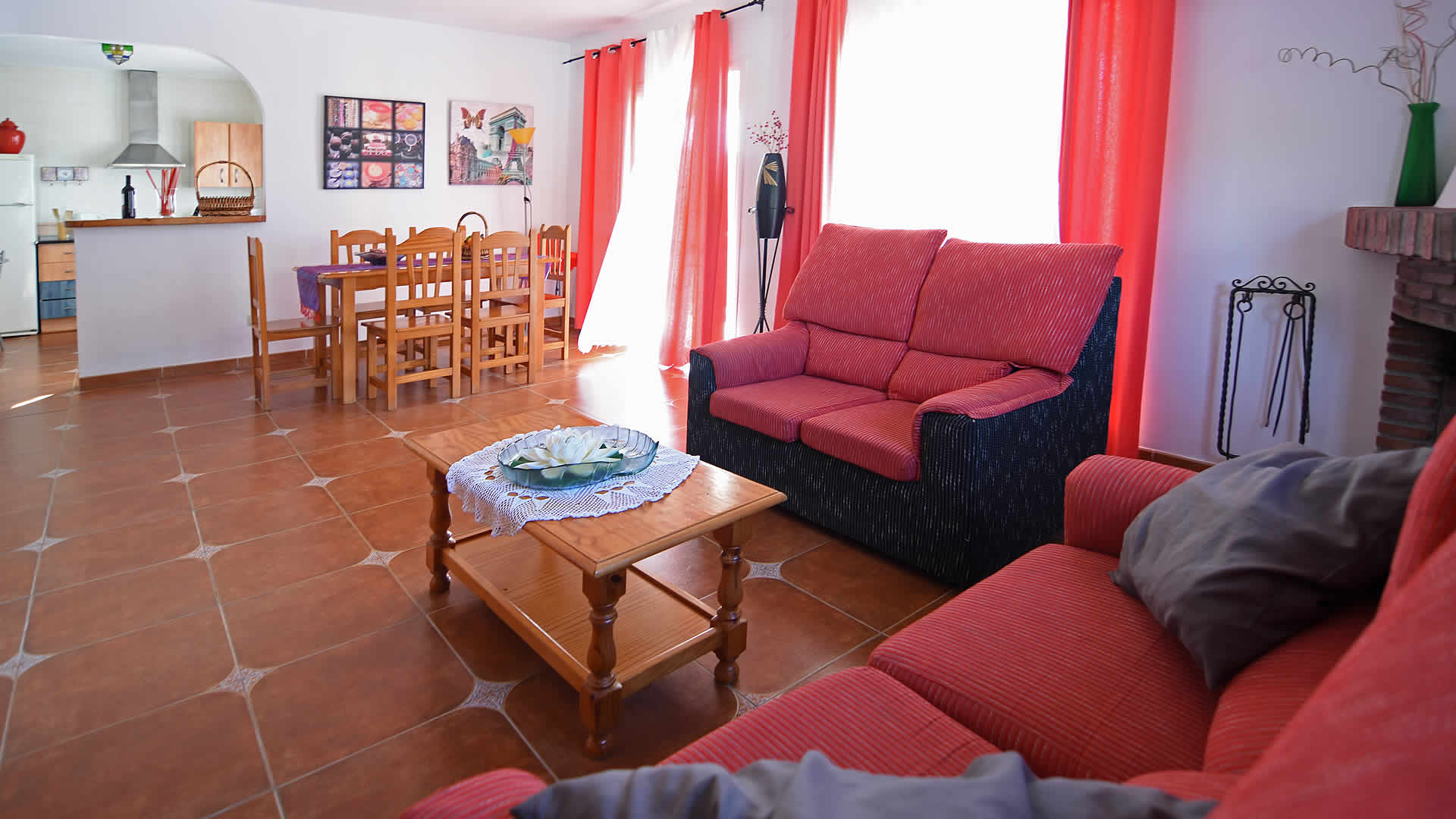 Toutes les pièces sont au rez-de-chaussée, chaleureusement aménagées avec confort ; les planchers sont de carrelage. Le salon/salle à manger a un foyer ouvert, un divan, 2 fauteuils et la télévision par satellite. La cuisine a une plaque de cuisson vitrocéramique à 4 feux, micro-ondes, réfrigérateur/congélateur, lave-vaisselle et lave-linge. Il y a 3 chambres et 2 salles de bain.