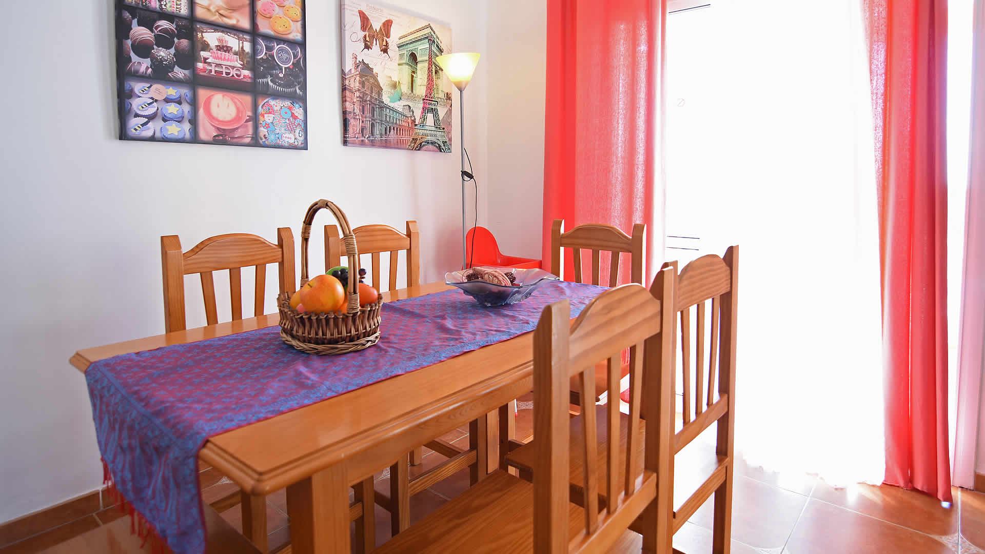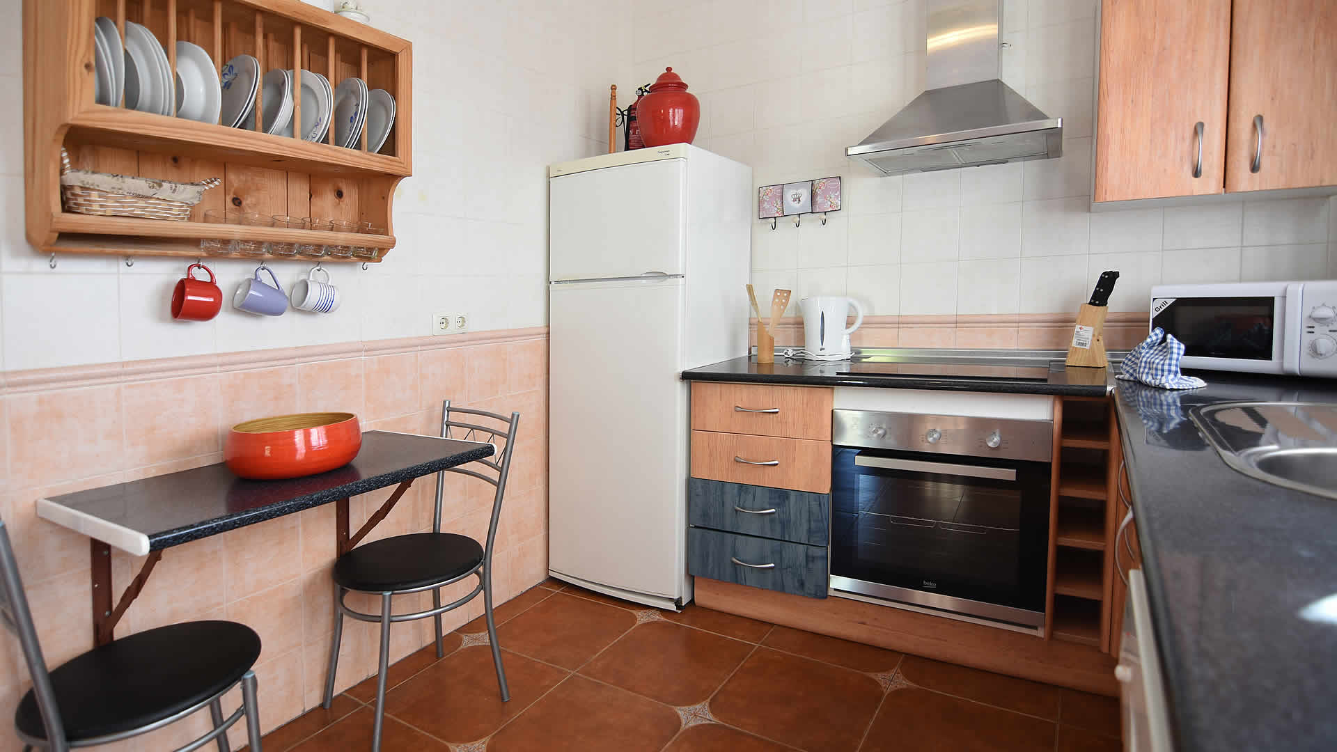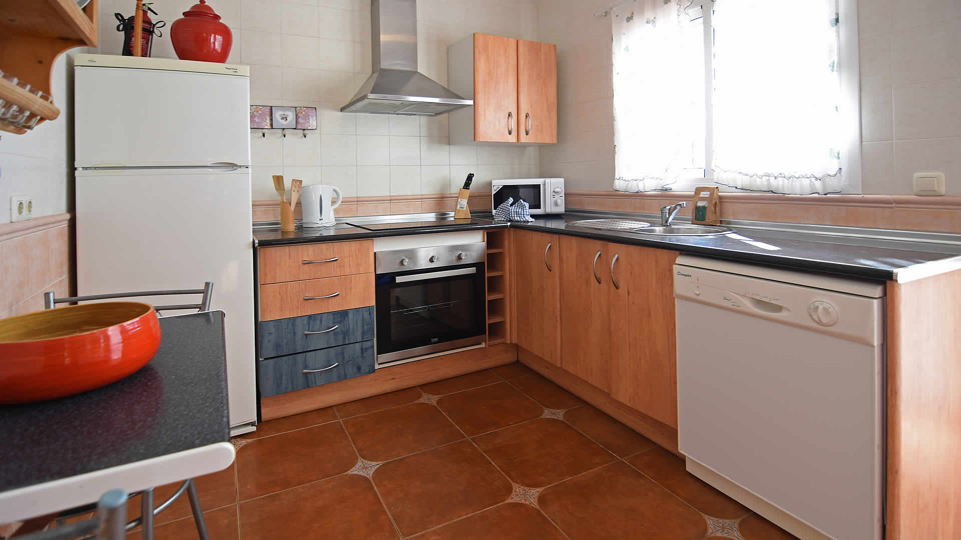 Toutes les pièces sont au rez-de-chaussée, chaleureusement aménagées avec confort ; les planchers sont de carrelage. Le salon/salle à manger a un foyer ouvert, un divan, 2 fauteuils et la télévision par satellite. La cuisine a une plaque de cuisson vitrocéramique à 4 feux, micro-ondes, réfrigérateur/congélateur, lave-vaisselle et lave-linge. Il y a 3 chambres et 2 salles de bain.
