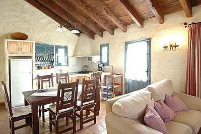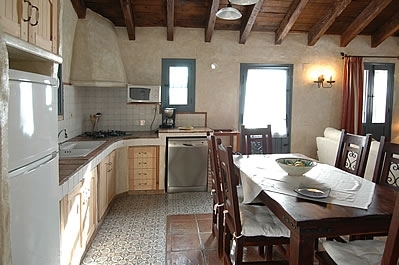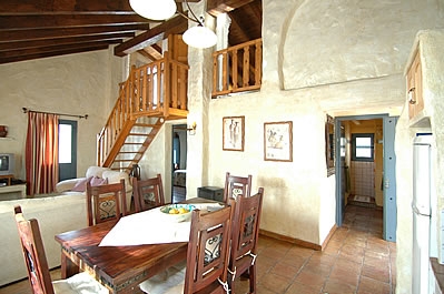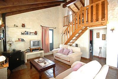 Elegantemente amueblado y decorado, este chalet ofrece un buen nivel de confort, con techos con vigas de madera y bonitos muebles de estilo rústico. La entrada principal se abre a un gran salón/comedor que dispone de estufa de leña, TV vía satélite, reproductor de DVD, equipo de música y aire acondicionado. La cocina abierta al salón está totalmente equipada con cocina de gas de 4 fuegos, microondas, nevera/congelador y lavavajillas. La lavadora está en un cuarto en el exterior. Hay dos dormitorios dobles románticos (con 2 camas individuales cada uno), con armarios empotrados y un cuarto de ducha decorado de forma tradicional, con WC y lavabo. Una escalera de madera abierta conduce a un dormitorio tipo loft con una cama de matrimonio "king size" y un cuarto de baño en suite, con lavabo y WC.