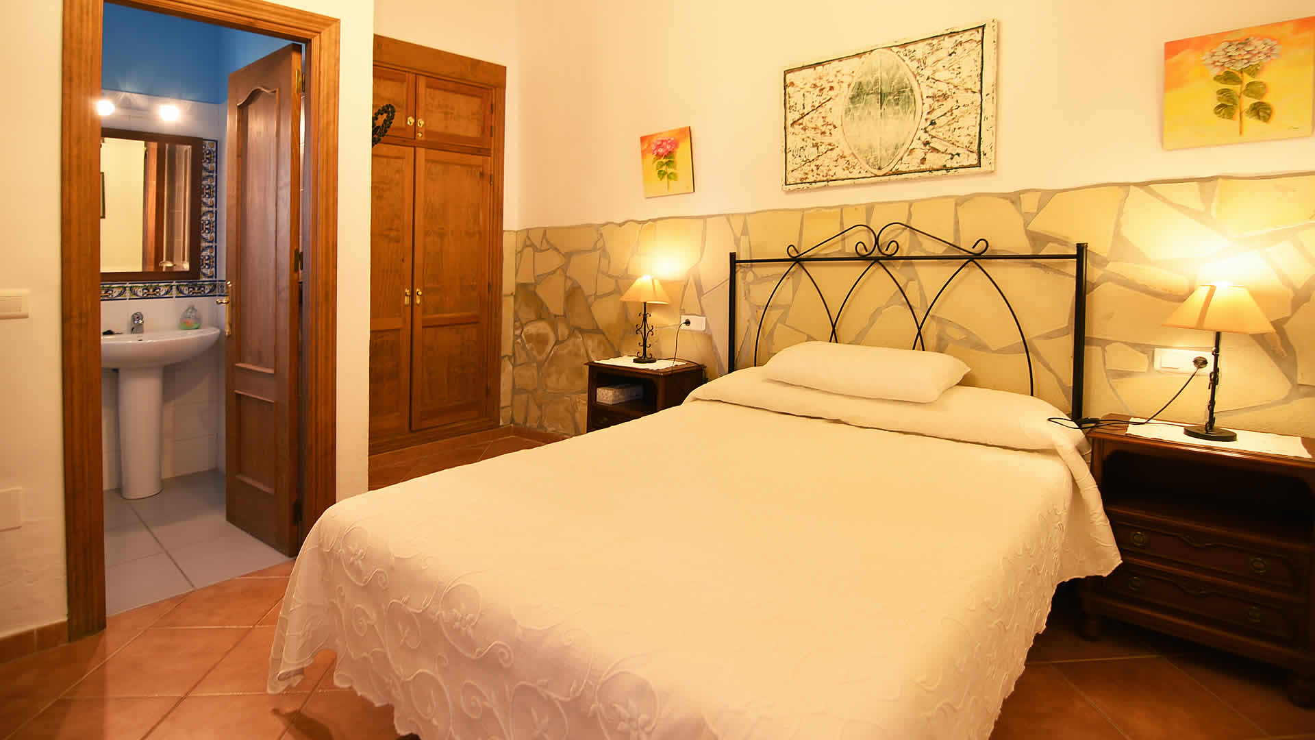 Las estancias de la casa se organizan en una sola planta. El salón/comedor tiene un mobiliario sencillo pero confortable, con chimenea, mesa comedor, sofás, estanterÃa de pladur estilo andaluz y TV vÃa satélite. La cocina abierta al salón está equipada con placa vitrocerámica, microondas, frigorÃfico/congelador, lavavajillas y lavadora. Los dormitorios pueden acomodar a 6 personas: el dormitorio principal tiene una cama de matrimonio y un cuarto de ducha ensuite con WC y lavabo; cuenta con dos dormitorios dobles más, uno con cama de matrimonio y otro con dos camas individuales, que comparten un baño completo con WC, bañera, bidet y lavabo. Hay conexión a Internet WiFi sin cargo adicional.