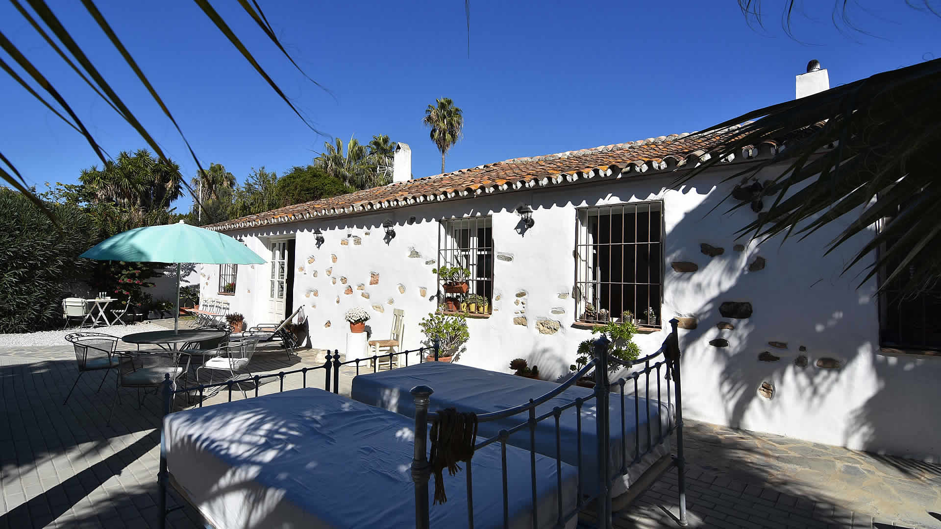 Se accede al cortijo a través de una terraza que se encuentra delante de la casa. En el patio interior se encuentra la piscina privada (6m x 4m), como un secreto bien-guardado. Desde aquí, antiguas puertas de madera abren hacia una sombreada terraza 'chill-out' con 2 camas antiguas al aire libre. Hay barbacoa y mobiliario de jardín para disfrutar las comidas al aire libre. El mar esta a tan sólo 300 metros, una distancia que ofrece la posibilidad de ir de paseo por la playa hasta llegar a Nerja, en menos de 15 minutos. Aquéllos que quieren enriquecer su conocimiento cultural pueden visitar el Museo Picasso en Malaga, el Alhambra en Granada o uno de los muchos lugares interesantes en Andalucia. Nota: para ir a la playa hay que cruzar la N340, por lo que será necesario acompañar a los niños.