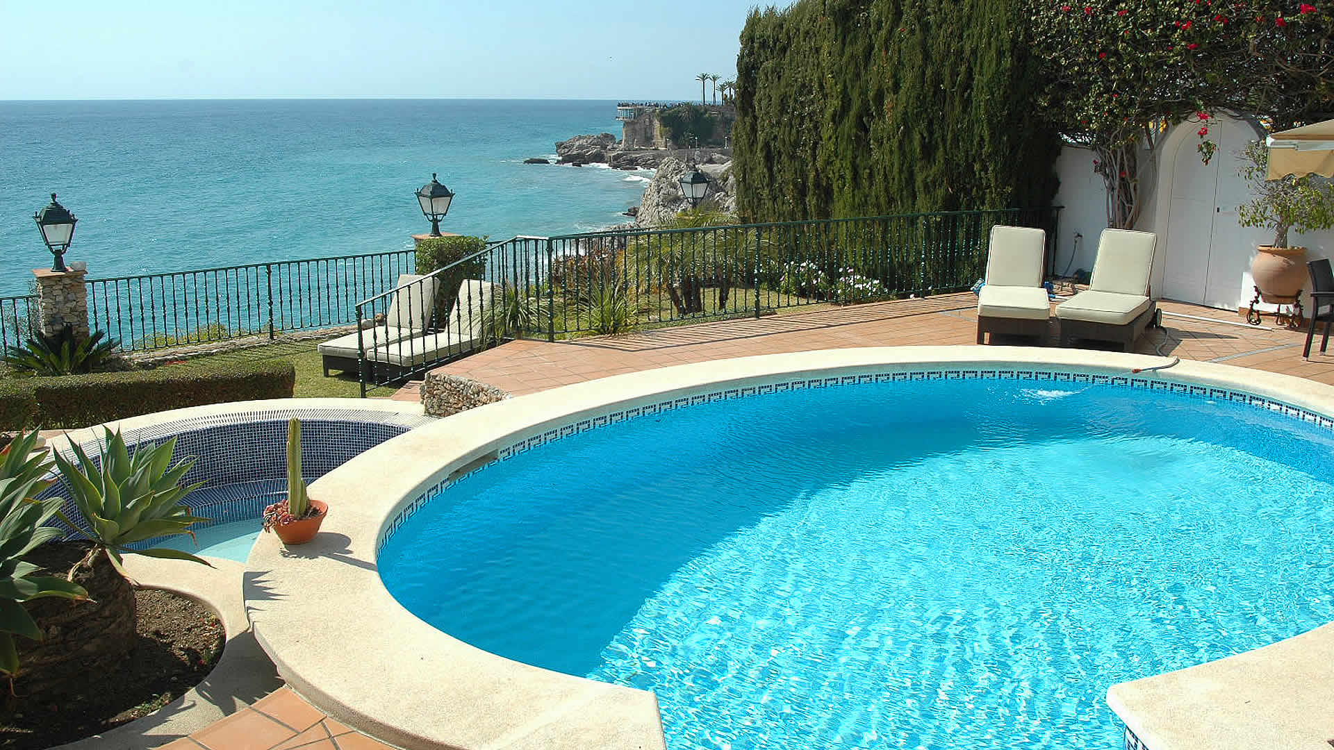 This property has the 'WOW' factor stamped all over it! Huge marble-floored room’s downstairs, stunning master bedrooms with beautiful sea views upstairs. Add perfectly appointed bathrooms and a walk-in wardrobe. Best of all though is the location. Sat on a cliff top overlooking the beach, with great views of the Balcon at night. The beautifully manicured and landscaped gardens are huge! Plateaued on separate levels with twin pools (the larger overflowing into the smaller), there is seating for many with sun loungers, tables and canopied areas. The setting is perfect and extremely private! Quiet at all times of day and night and yet a 2 minute stroll into Nerja!