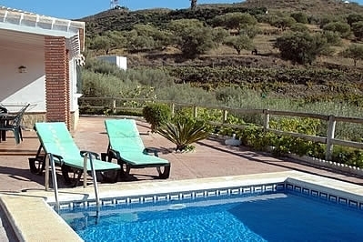 Simpática casita situada en el campo entre olivos y aguacates. Torrox Costa y sus playas están a 3,5 km y las tiendas y restaurantes de la nueva urbanización Torrox Parck a tan solo 2 km. Preciosas vistas sobre el paisaje y frutales alrededor de la casa. Bonita zona de terraza y césped, con piscina (6x3 m) y 6 tumbonas. Acogedor porche con mesa comedor. Hay 1,2 km sin asfaltar.